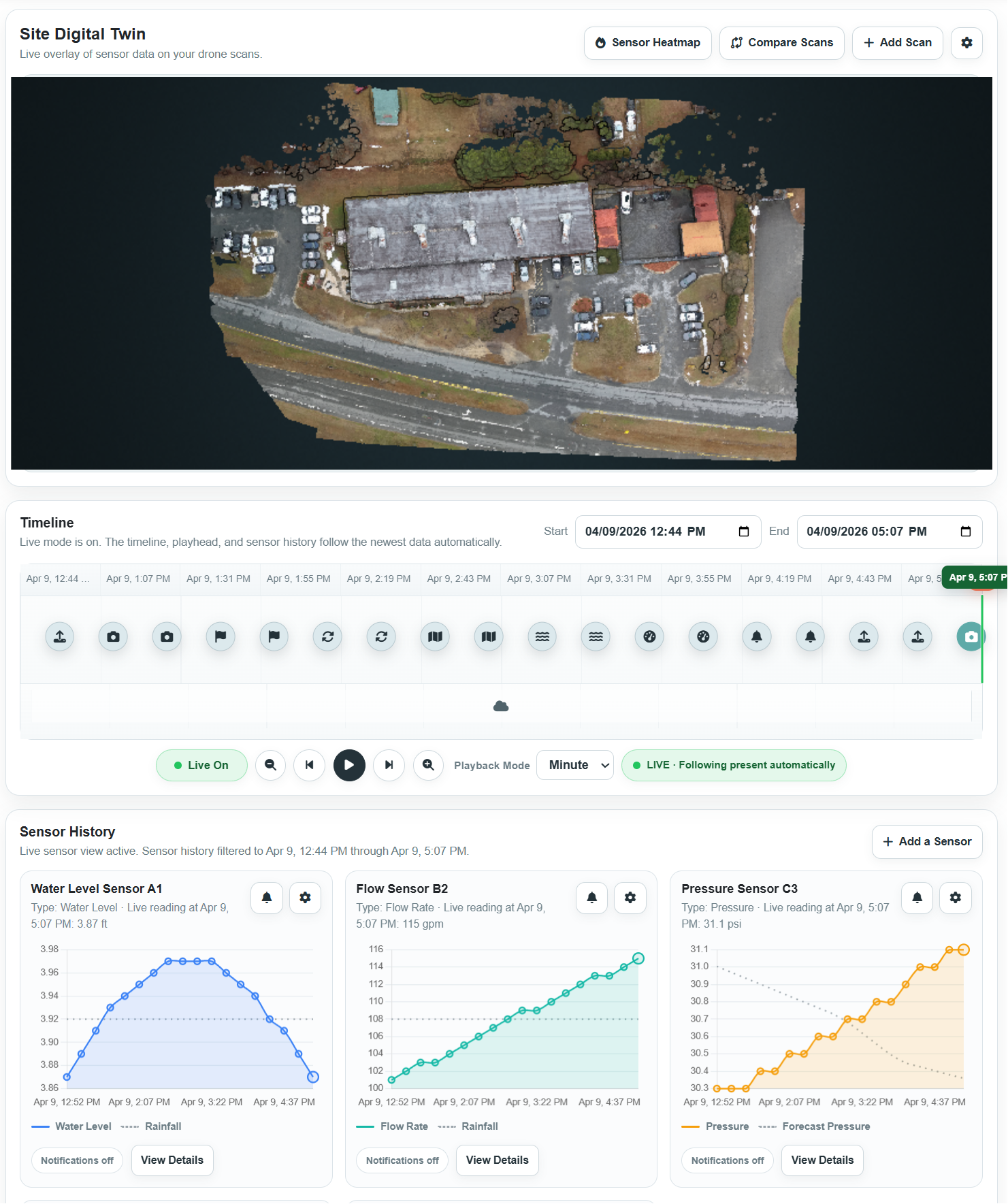 Bring drone scans, historical comparison, and live sensor data into one visual system built for earlier visibility and better decisions.